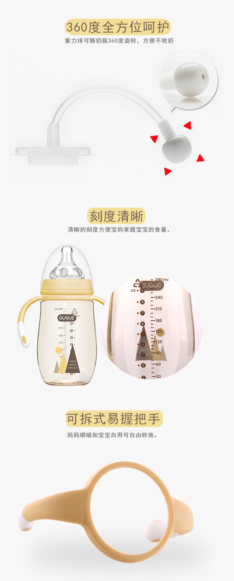 顏 色:都市灰/典雅黃/簡約白      材 質:PPSU(奶瓶瓶身呈淡茶色)